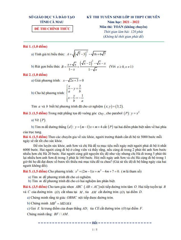 Đề thi vào 10 chuyên môn Toán (không chuyên) năm 2021 – 2022 sở GD&ĐT Cà Mau