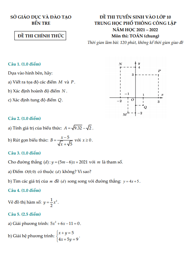 Đề tuyển sinh lớp 10 môn Toán (chung) năm 2021 – 2022 sở GD&ĐT Bến Tre