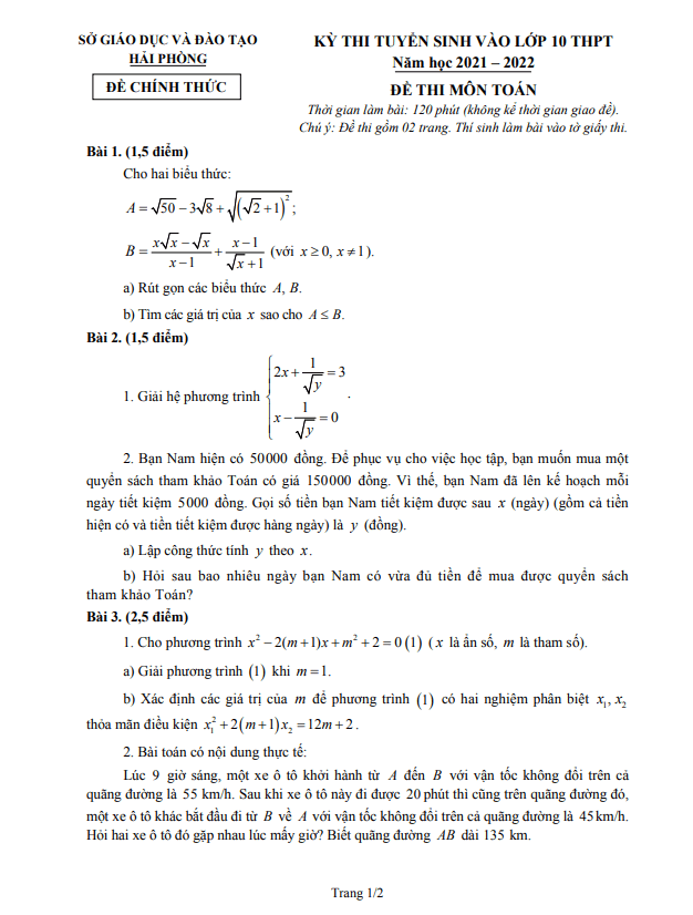 Đề tuyển sinh lớp 10 môn Toán năm 2021 – 2022 sở GD&ĐT Hải Phòng