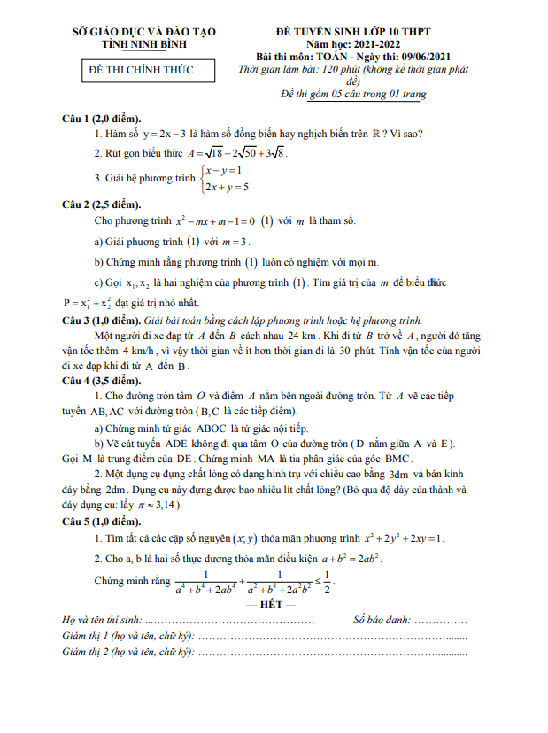 Đề tuyển sinh lớp 10 môn Toán năm 2021 – 2022 sở GD&ĐT Ninh Bình