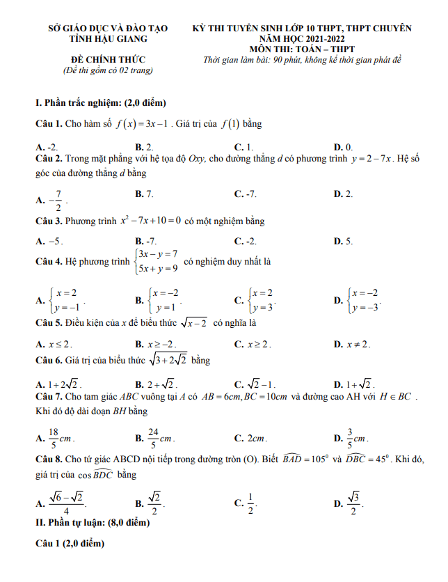 Đề tuyển sinh vào lớp 10 môn Toán năm 2021 – 2022 sở GD&ĐT Hậu Giang