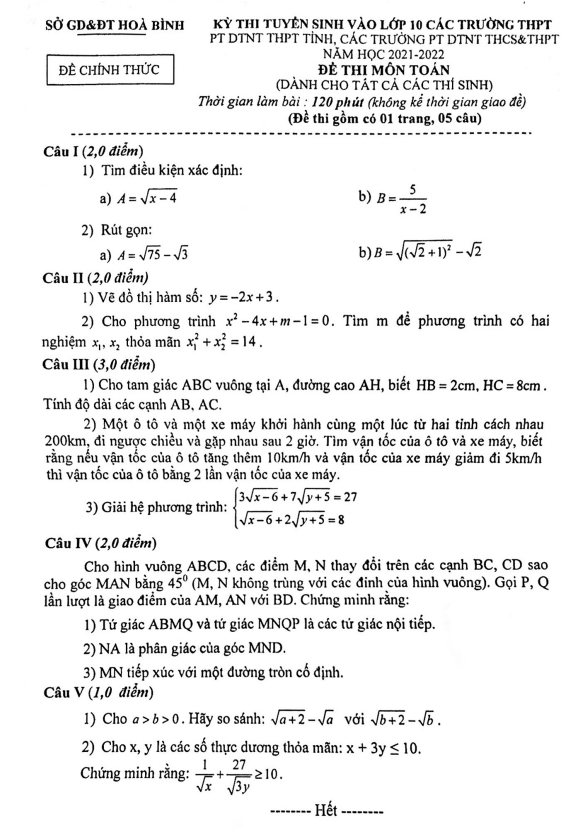 Đề tuyển sinh vào lớp 10 môn Toán năm 2021 – 2022 sở GD&ĐT Hòa Bình