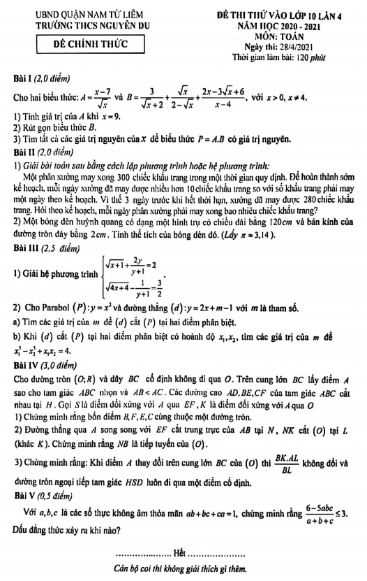 Đề thi thử Toán vào lớp 10 lần 4 năm 2020 – 2021 trường Nguyễn Du – Hà Nội