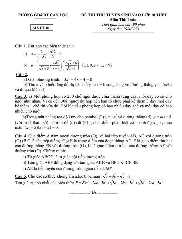 Đề thi thử Toán vào lớp 10 năm 2021 – 2022 phòng GD&ĐT Can Lộc – Hà Tĩnh