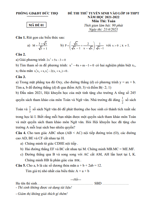 Đề thi thử Toán vào lớp 10 năm 2021 – 2022 phòng GD&ĐT Đức Thọ – Hà Tĩnh