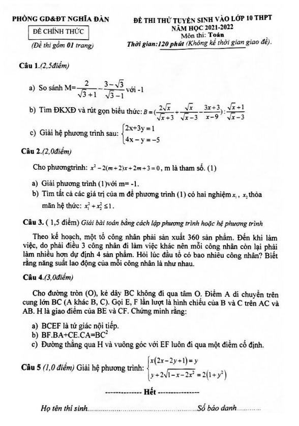 Đề thi thử Toán vào lớp 10 năm 2021 – 2022 phòng GD&ĐT Nghĩa Đàn – Nghệ An