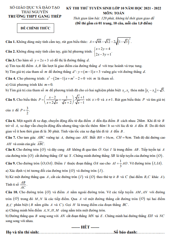 Đề thi thử Toán vào lớp 10 năm 2021 – 2022 trường THPT Gang Thép – Thái Nguyên