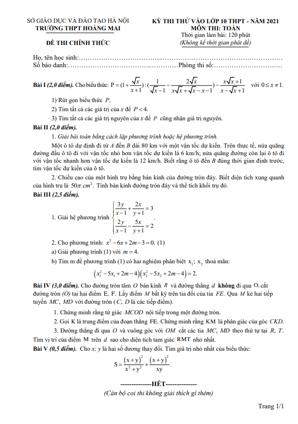 Đề thi thử Toán vào lớp 10 năm 2021 trường THPT Hoàng Mai – Hà Nội