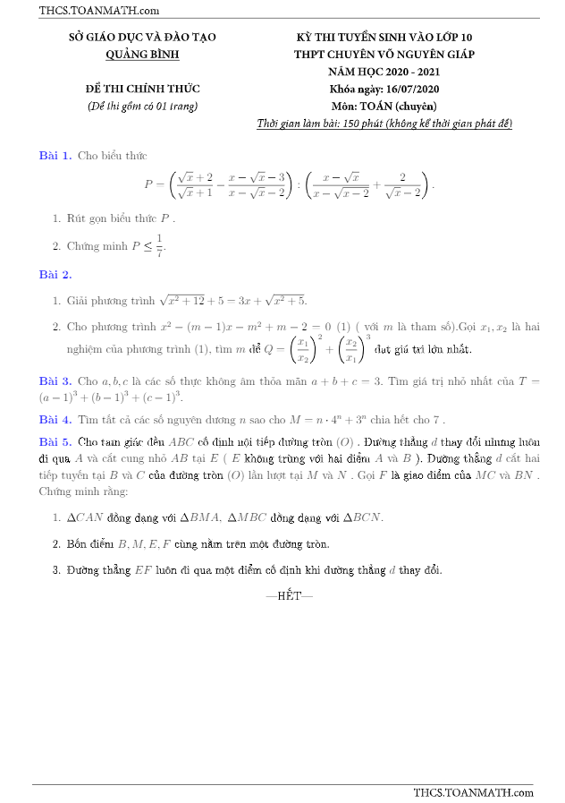 Đề thi vào 10 môn Toán (chuyên) năm 2020 – 2021 trường chuyên Võ Nguyên Giáp – Quảng Bình