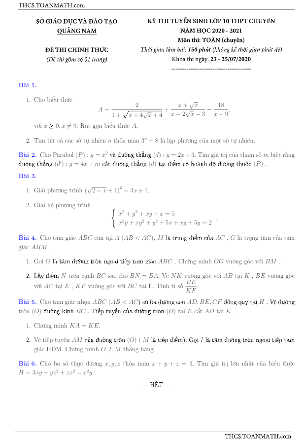 Đề tuyển sinh lớp 10 chuyên môn Toán (chuyên) năm 2020 – 2021 sở GD&ĐT Quảng Nam