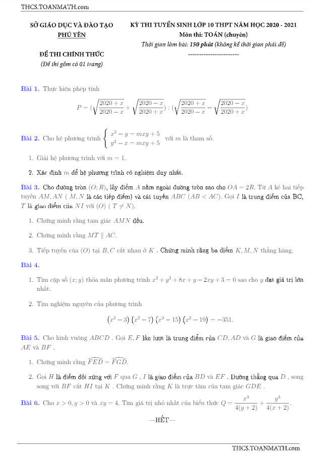 Đề tuyển sinh lớp 10 môn Toán (chuyên) năm 2020 – 2021 sở GD&ĐT Phú Yên