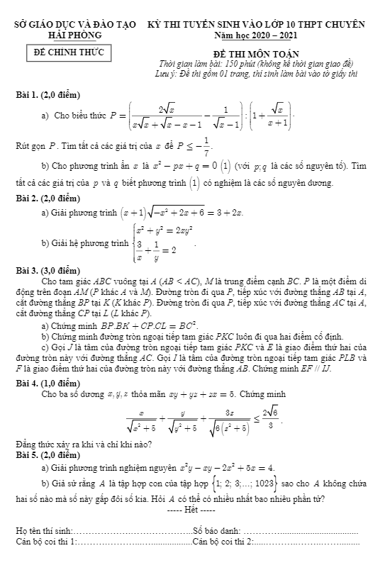 Đề tuyển sinh lớp 10 THPT chuyên môn Toán năm 2020 – 2021 sở GD&ĐT Hải Phòng