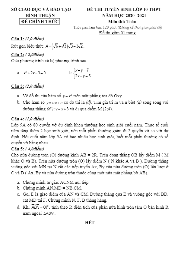 Đề tuyển sinh lớp 10 THPT môn Toán năm 2020 – 2021 sở GD&ĐT Bình Thuận