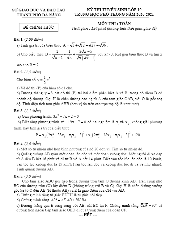 Đề tuyển sinh lớp 10 THPT môn Toán năm 2020 – 2021 sở GD&ĐT Đà Nẵng