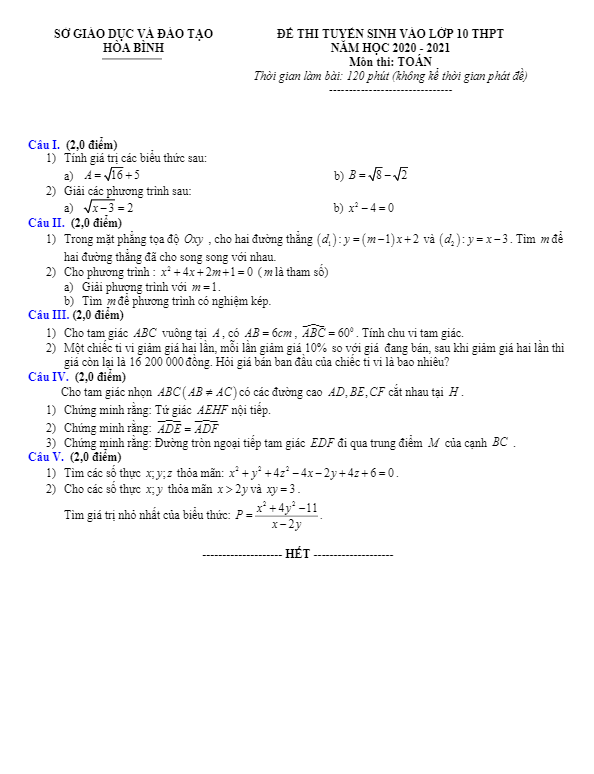 Đề tuyển sinh lớp 10 THPT môn Toán năm 2020 – 2021 sở GD&ĐT Hòa Bình
