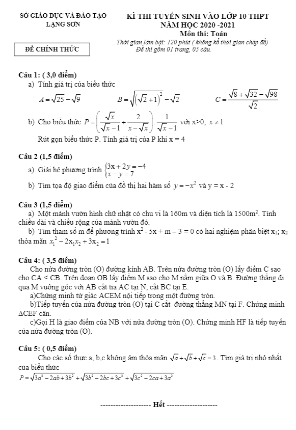 Đề tuyển sinh lớp 10 THPT môn Toán năm 2020 – 2021 sở GD&ĐT Lạng Sơn