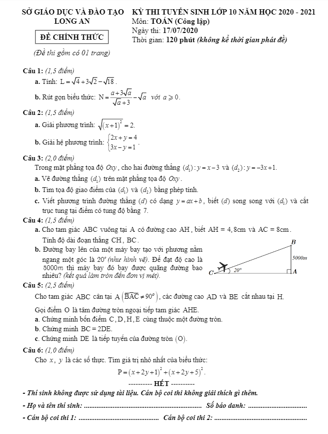 Đề tuyển sinh lớp 10 THPT môn Toán năm 2020 – 2021 sở GD&ĐT Long An