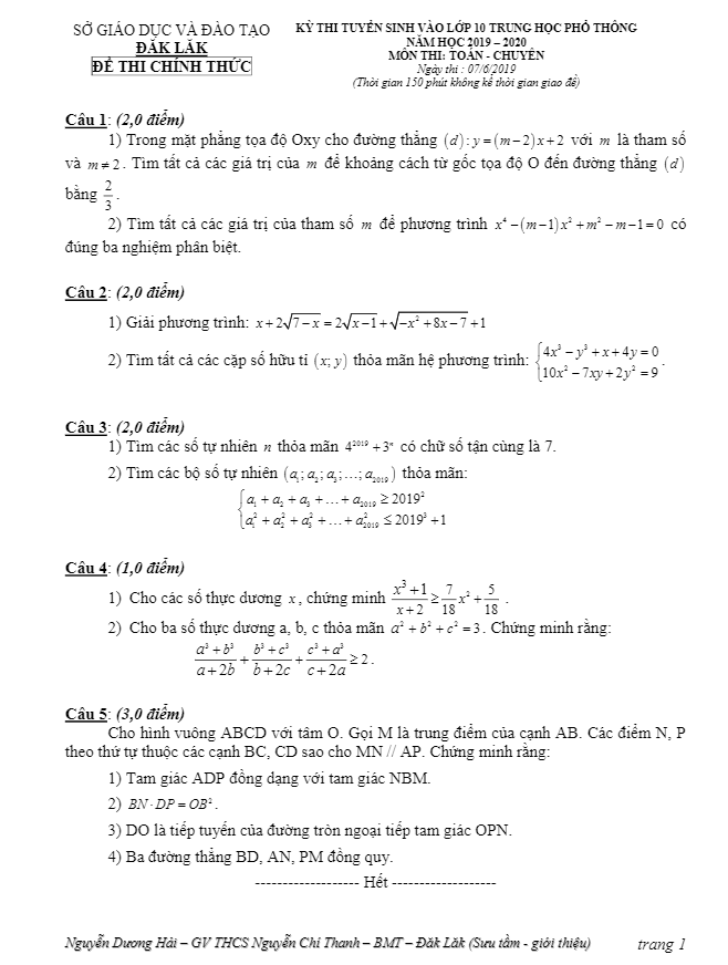Đề Toán tuyển sinh lớp 10 chuyên năm 2019 – 2020 sở GD&ĐT Đắk Lắk
