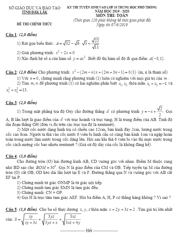 Đề Toán tuyển sinh lớp 10 THPT năm 2019 – 2020 sở GD và ĐT Đắk Lắk