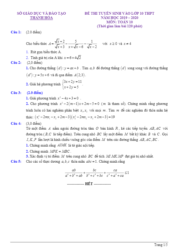 Đề Toán tuyển sinh lớp 10 THPT năm 2019 – 2020 sở GD&ĐT Thanh Hóa