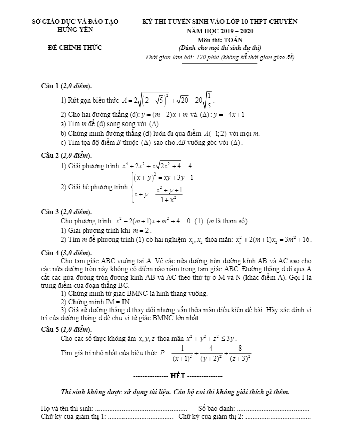Đề Toán tuyển sinh vào 10 chuyên năm 2019 – 2020 sở GD&ĐT Hưng Yên (Đề chung)