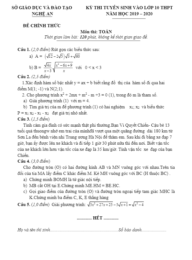 Đề tuyển sinh vào lớp 10 năm 2019 – 2020 môn Toán sở GD&ĐT Nghệ An