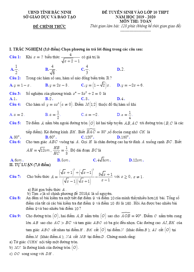 Đề Toán tuyển sinh lớp 10 năm 2019 – 2020 sở GD&ĐT Bắc Ninh