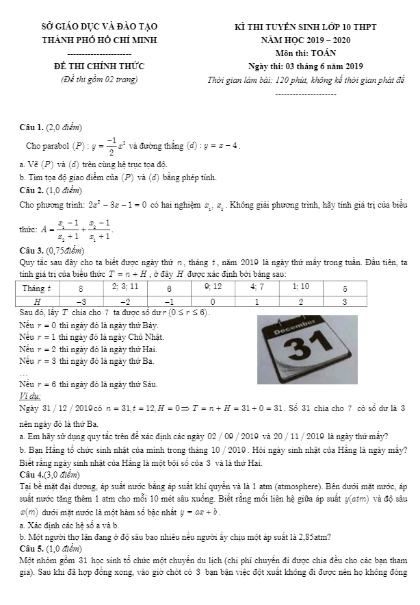 Đề Toán tuyển sinh lớp 10 năm 2019 – 2020 sở GD&ĐT thành phố Hồ Chí Minh