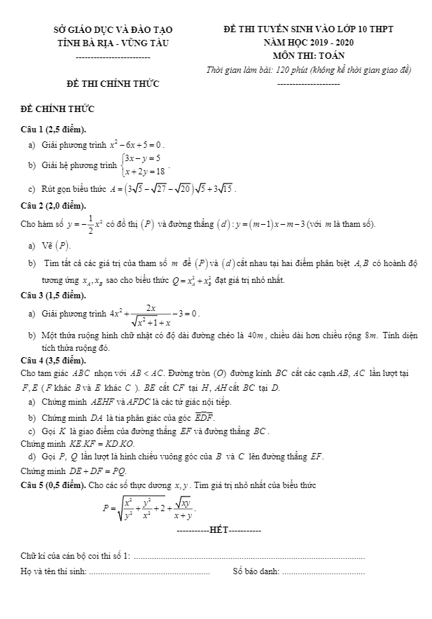 Đề Toán tuyển sinh lớp 10 năm 2019 – 2020 trường chuyên Lê Quý Đôn – BRVT (Vòng 1)