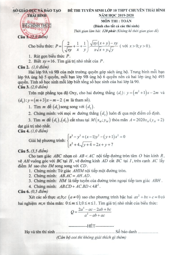 Đề Toán tuyển sinh lớp 10 năm 2019 – 2020 trường chuyên Thái Bình (Vòng 2)