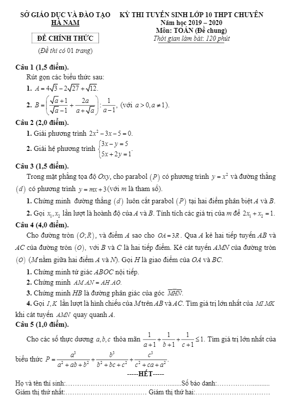 Đề Toán tuyển sinh lớp 10 THPT chuyên năm 2019 – 2020 sở GD&ĐT Hà Nam (Đề chung)