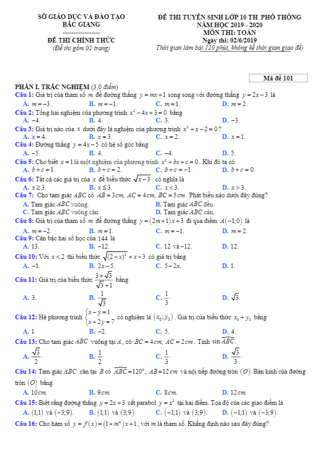 Đề Toán tuyển sinh lớp 10 THPT năm 2019 – 2020 sở GD&ĐT Bắc Giang