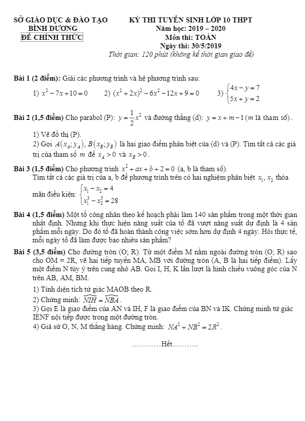 Đề Toán tuyển sinh lớp 10 THPT năm 2019 – 2020 sở GD&ĐT Bình Dương