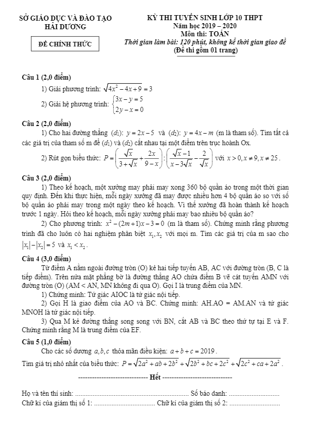 Đề Toán tuyển sinh lớp 10 THPT năm 2019 – 2020 sở GD&ĐT Hải Dương