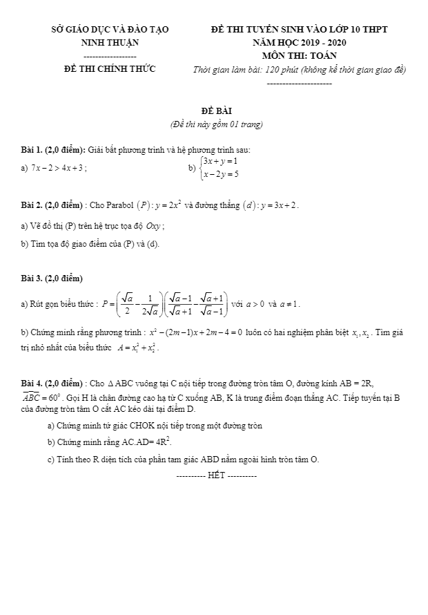 Đề Toán tuyển sinh lớp 10 THPT năm 2019 – 2020 sở GD&ĐT Ninh Thuận