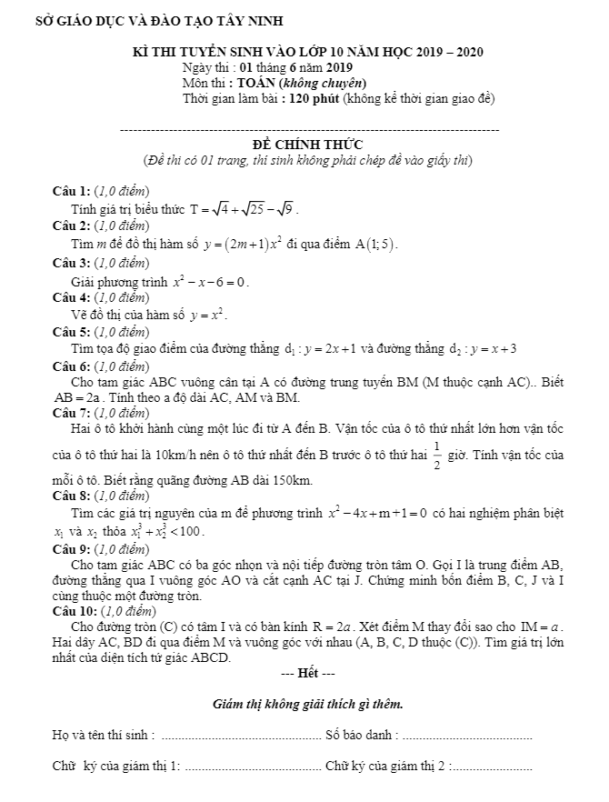 Đề Toán tuyển sinh vào lớp 10 năm học 2019 – 2020 sở GD&ĐT Tây Ninh
