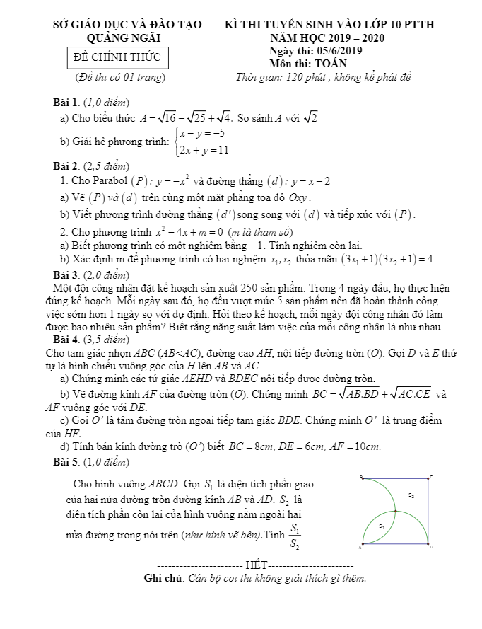 Đề tuyển sinh lớp 10 năm 2019 – 2020 môn Toán sở GD&ĐT Quảng Ngãi