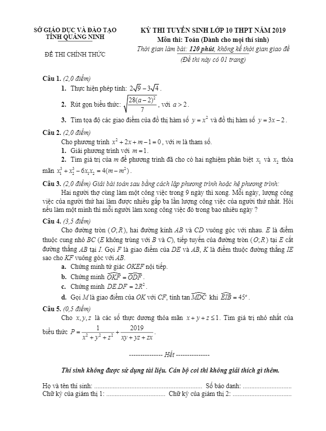 Đề tuyển sinh lớp 10 THPT năm 2019 môn Toán sở GD&ĐT Quảng Ninh