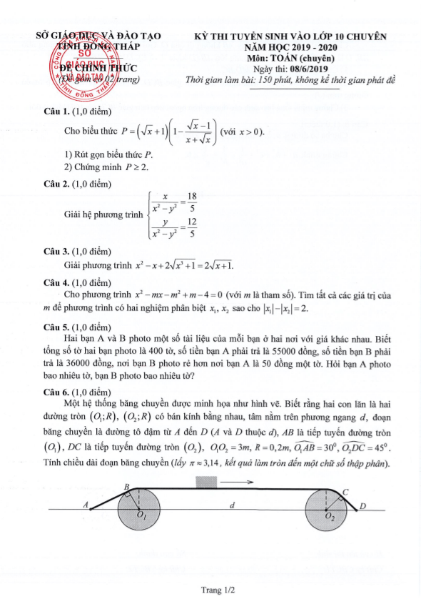 Đề tuyển sinh vào 10 môn Toán chuyên năm 2019 – 2020 sở GD&ĐT Đồng Tháp