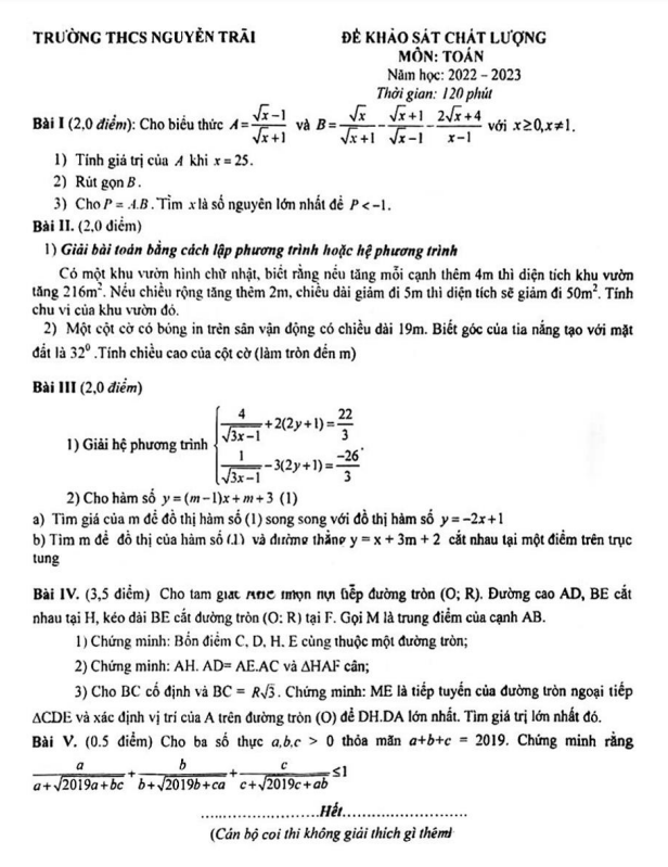 Đề khảo sát chất lượng Toán 9 năm 2022 – 2023 trường THCS Nguyễn Trãi – Hà Nội