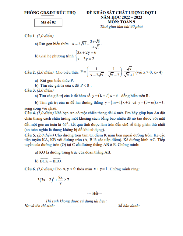 Đề khảo sát đợt 1 Toán 9 năm 2022 – 2023 phòng GD&ĐT Đức Thọ – Hà Tĩnh