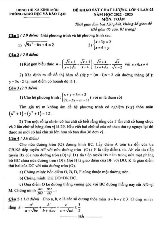 Đề khảo sát Toán 9 lần 3 năm 2022 – 2023 phòng GD&ĐT Kinh Môn – Hải Dương