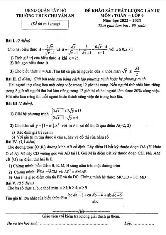 Đề khảo sát Toán 9 lần 3 năm 2022 – 2023 trường THCS Chu Văn An – Hà Nội