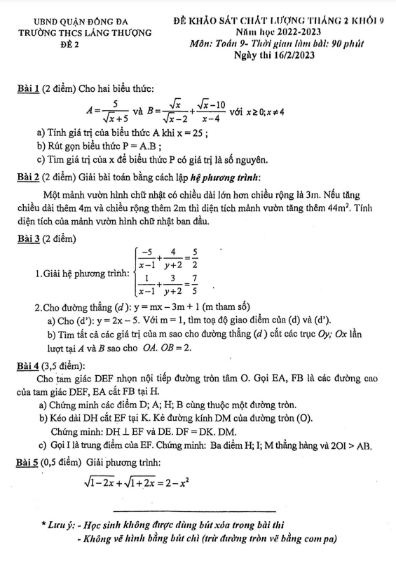 Đề khảo sát Toán 9 tháng 2 năm 2023 trường THCS Láng Thượng – Hà Nội