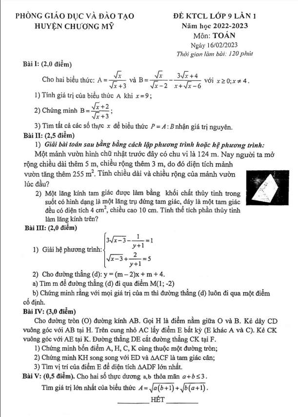 Đề KTCL Toán 9 lần 1 năm 2022 – 2023 phòng GD&ĐT Chương Mỹ – Hà Nội
