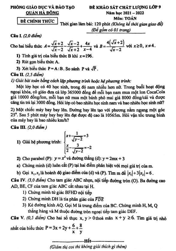 Đề khảo sát chất lượng Toán 9 năm 2021 – 2022 phòng GD&ĐT Hà Đông – Hà Nội