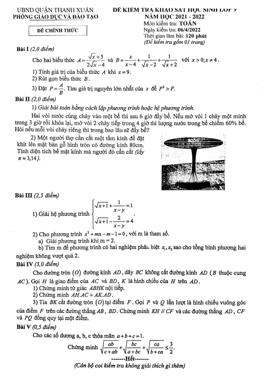 Đề khảo sát Toán 9 năm 2021 – 2022 phòng GD&ĐT Thanh Xuân – Hà Nội
