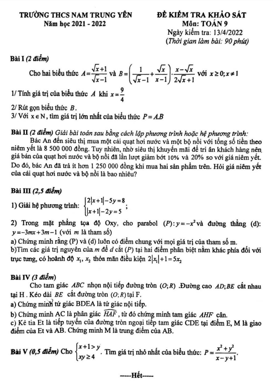 Đề khảo sát Toán 9 năm 2021 – 2022 trường THCS Nam Trung Yên – Hà Nội