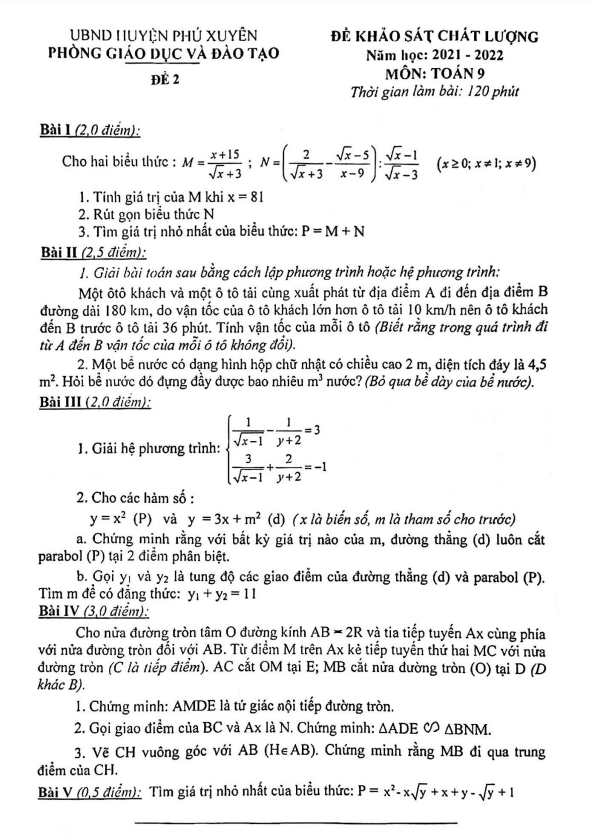 Đề khảo sát chất lượng Toán 9 năm 2021 – 2022 sở GD&ĐT Thanh Hóa