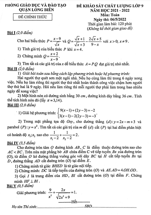 Đề khảo sát chất lượng Toán 9 năm 2021 – 2022 phòng GD&ĐT Long Biên – Hà Nội